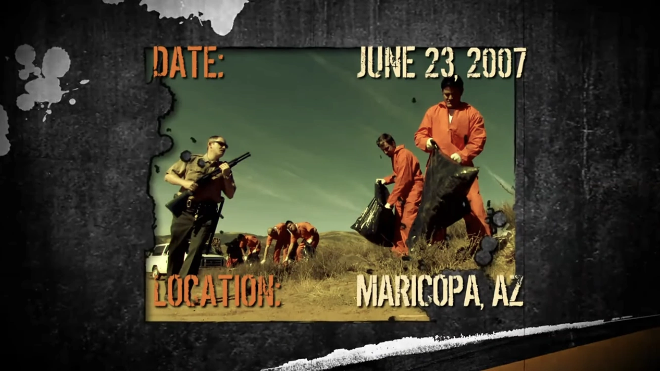 Two prisoners named Mack and Billy were on a chain gang attempt to escape by jumping into the bed of a passing pickup truck. The truck driver was playing some ear-splitting country music and didn't hear anything from outside, but when the chain of Mack and Billy's leg irons wrapped around the truck's hitch, they were dragged along the ground like a rag doll and die from blood loss, skull fracture and multiple bone fractures.