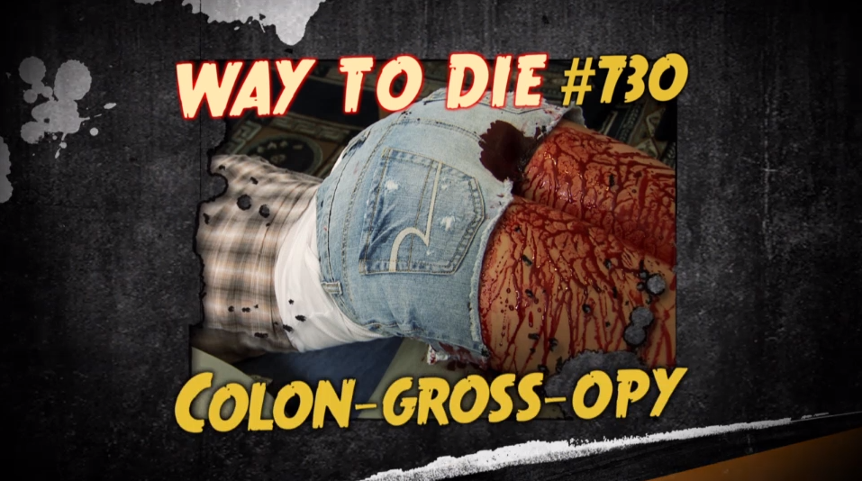 "Colon-gross-opy", Way to Die #730, is the seventh and last death featured in "Dirt Nap", which aired on November 7, 2011.