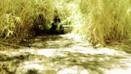 (Ting gets on ATV, rides, spreads mud to the guard holding an AK, [] is playing)